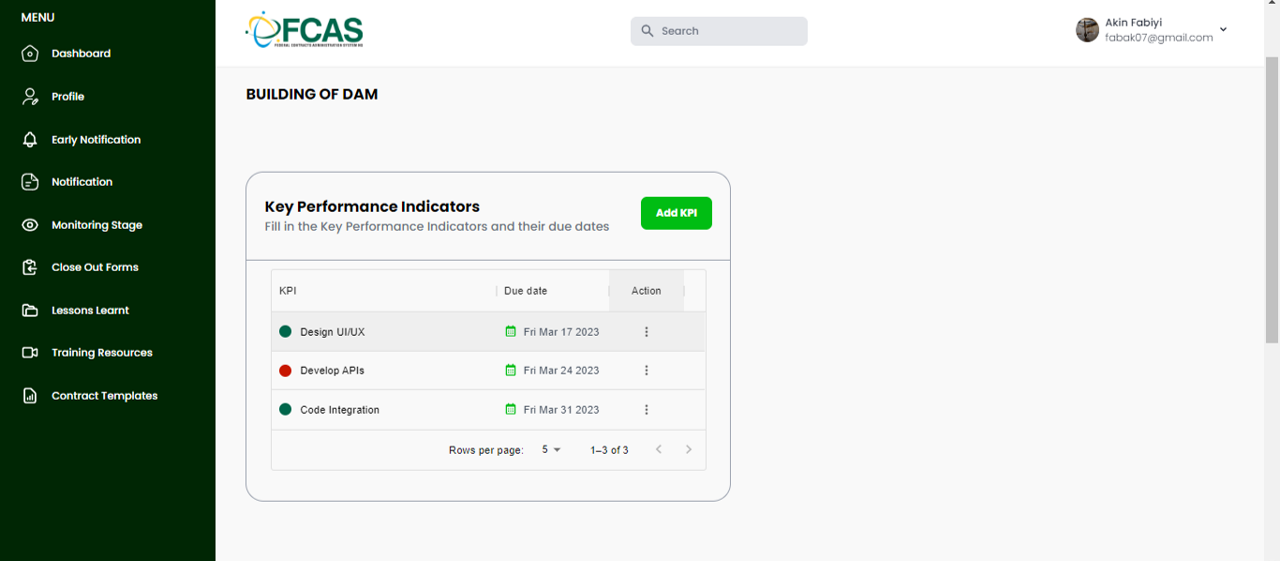 A post-award administration system is crucial to the successful implementation/completion of contracts. At the project kick-off stage, after the execution of the contract document, the executed contract, and its accompanying documents (Contract Registration Form, PACAF, Risk management form etc) are uploaded on the eFCAS by the MDA’s LA not later than two days after the contract execution. The hard copy documents shall be submitted at the FMOJ and a file opened for the contract administration. A unique eFCAS No shall be generated for every contract registered in the system. The open file shall also have written on it the unique eFCAS No for ease of tracking.